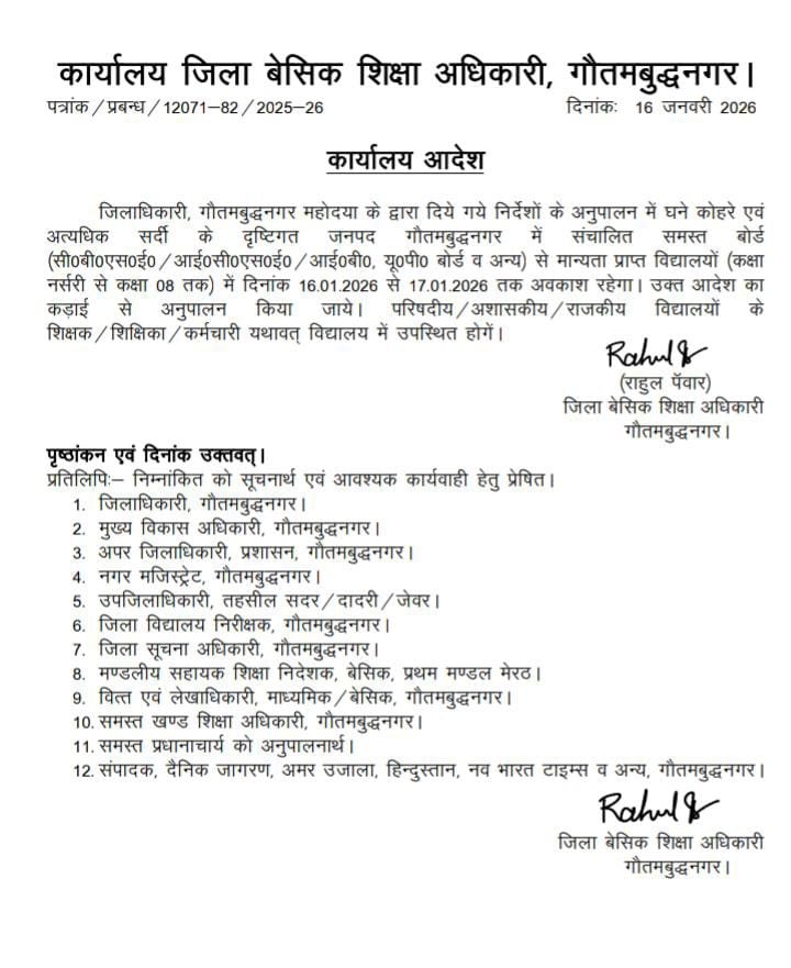 यह निर्णय ऐसे समय में आया है जब पूरा उत्तर भारत भीषण ठंड की चपेट में है। घने कोहरे और गिरते तापमान ने जनजीवन को अस्त-व्यस्त कर दिया है। ऐसे मौसम में बच्चों के स्वास्थ्य पर प्रतिकूल प्रभाव पड़ सकता है, इसी को ध्यान में रखते हुए प्रशासन ने यह एहतियाती कदम उठाया है।