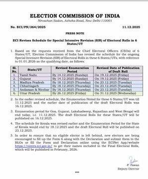 उत्तर प्रदेश समेत छह राज्यों में SIR प्रक्रिया की समयसीमा बढ़ा दी गई है। यूपी में SIR फॉर्म जमा करने की अंतिम तिथि अब 26 दिसंबर तय की गई है।